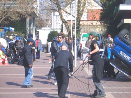 In dieses Auto sollte nun noch ein BMW reinfahren. (In Wirklichkeit fuhr er nur hautnah vorbei. Die Helfer mußten in diesem Moment an einem Seil ziehen, damit das blaue Auto, das vorher abgestützt und mit dem Seil verbunden war, noch weiter umfiel.