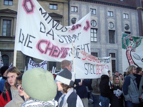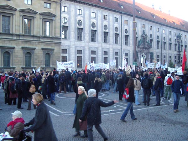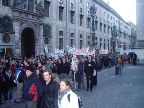 | SA, 13.12.2003: von Papa Auf unserem Fußmarsch von der Schellingstrasse zum Marienplatz gehen wir ja über den Odeonsplatz. Da war heut´ ne Demo. Und zwar demonstrieren die Studenten gegen die geplanten Kürzungen im Bildungssektor. Einige Eindrücke: ![]() ![]() ![]() ![]() ![]() So. Genug demonstriert. ;-)