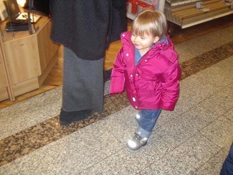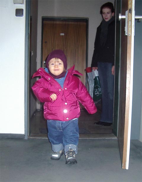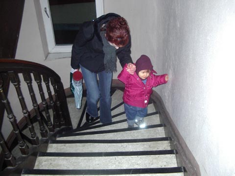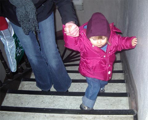 | DO, 18.03.2004: Von Papa Nochmal zum Treppensteigen-Üben: Mitte März 2004 - da wohnen wir schon in Markt Schwaben - bist Du das erste Mal die Treppen ALLEINE hoch. Und zwar beide Stockwerke. Zur Sicherheit bin ich ganz knapp hinter Dir gelaufen, um Dich notfalls auffangen zu können. War aber nicht nötig, Du warst sehr sicher. Eine Hand ist dann immer am Geländer oder an der Wand und hilft mit. Gegen Ende wurde es Dir dann aber zu anstrengend und Du bist die letzten paar Stufen hochgekrabbelt (auf allen Vieren). Als Du im Februar 2004 die zehn Tage bei Silvana warst, hast Du Treppensteigen wohl fleißig üben können.